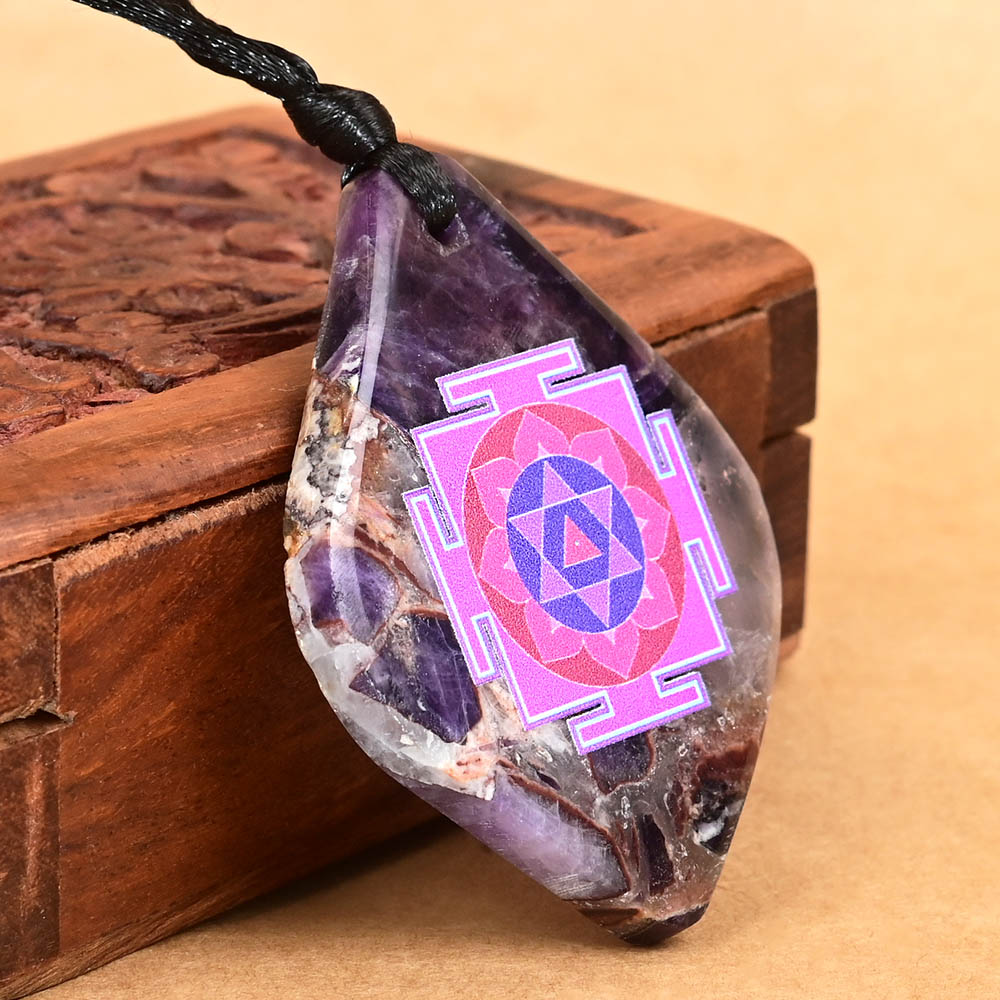 Vibrant pendant with Sacred Shiv Yantra printed on natural Amethyst gemstone. The coloured Yantra image made of UV print is washable and long-lasting. Amethyst gemstone has properties of enhancing creativity, spiritualism, and overcoming additions and low self-esteem. The combination of Shiv Yantra and Amethyst provides courage, good health, good fortune, bliss and freedom from fear of death and diseases.