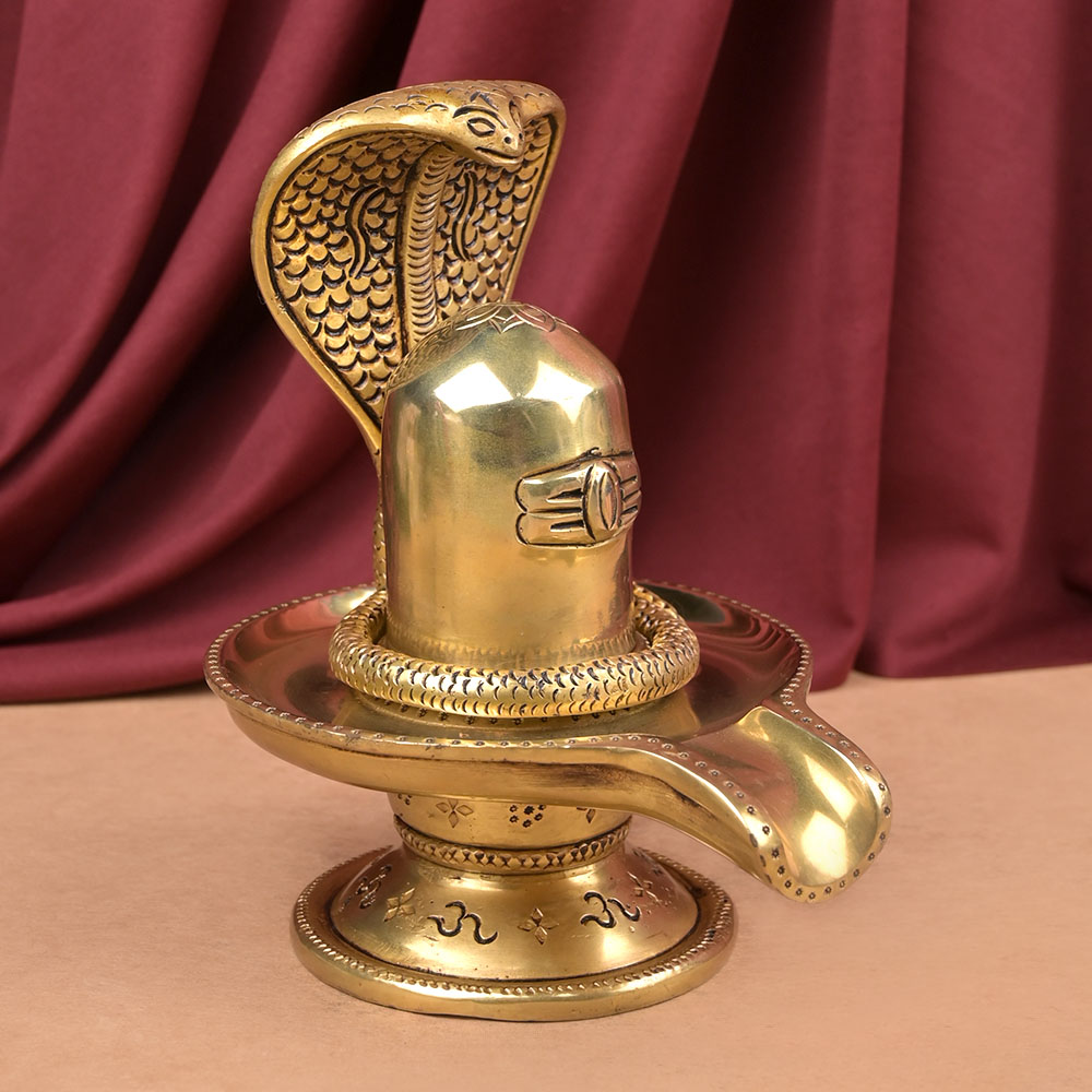 This Shilving along with a serpent coiling and forming a canopy above Lingam is made in shining brass. The carving of Om at base of Yoni and the Bel Patra and Third Eye carving on Lingam makes Lingam even more auspicious. Shivaling from time immemorial have been worshipped as a form of Lord Shiva. Installing and worshipping Shivlingam in puja altar of home or office promotes energies of unity, harmony, bliss, peace and spiritual elevation. The Shivling is to placed such that the Yoni base faces north direction and west face of Lingam is worshipped.