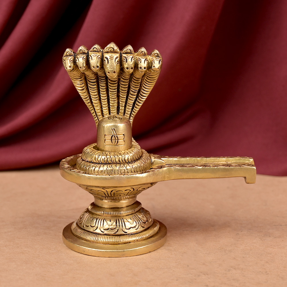 The Shivling with 7 Headed Vasuki Naag Brass small Idol is a sacred representation of Lord Shiva, featuring a finely crafted Shivling encircled by the protective hood of Vasuki Naag with its seven majestic heads. Cast in pure brass, the idol features intricate carvings, including the Trinetra (third eye) on the Lingam, symbolizing divine power, destruction of evil, and spiritual awakening. The base of the Shivling is detailed with ornate designs, and the elongated spout (Jaladhari) allows sacred water to flow out after Abhishek. Placing this divine idol at home or in your puja space invites spiritual protection, removes negativity, promotes peace, and enhances positive vibrations in the surroundings.