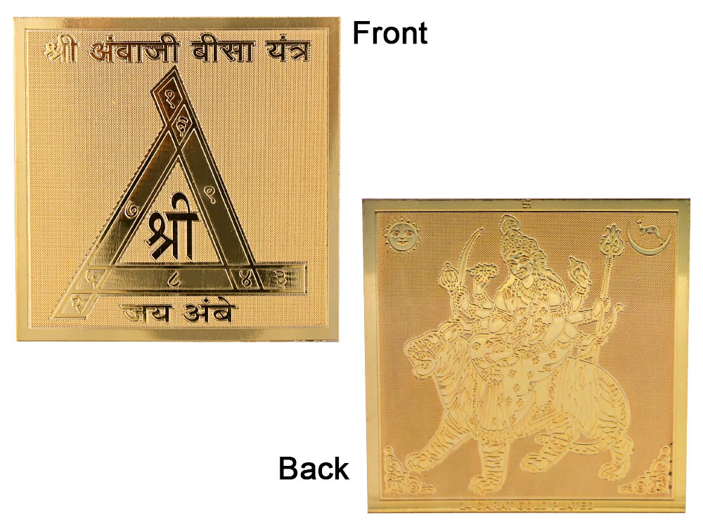 The Shree Ambaji Beesa Yantra is exquisitely crafted on a compact copper plate, adorned with a luxurious gold finish. The Yantra is perfect for carrying in your pocket or money purse, or for placing on your puja altar or work desk. This unique yantra is believed to bring positive outcomes and triumph over adversaries, while also alleviating obstacles and aiding in the fulfillment of aspirations.