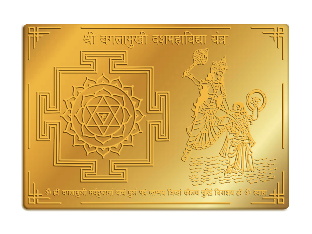 Blessed and energized Shree Baglamukhi Dusmahavidya Yantra, crafted in premium quality heavy Brass with Gold Finish, measuring 5 (W) x 3.5 (H) inches, with the option of a wooden frame or stand. This sacred Yantra embodies the energies of Goddess Baglamukhi, the eighth of the ten Mahavidyas, known for controlling and subduing enemies, ensuring victory in conflicts, and providing protection from negative energies. It aids in overcoming obstacles, resolving disputes, and promoting spiritual progress.