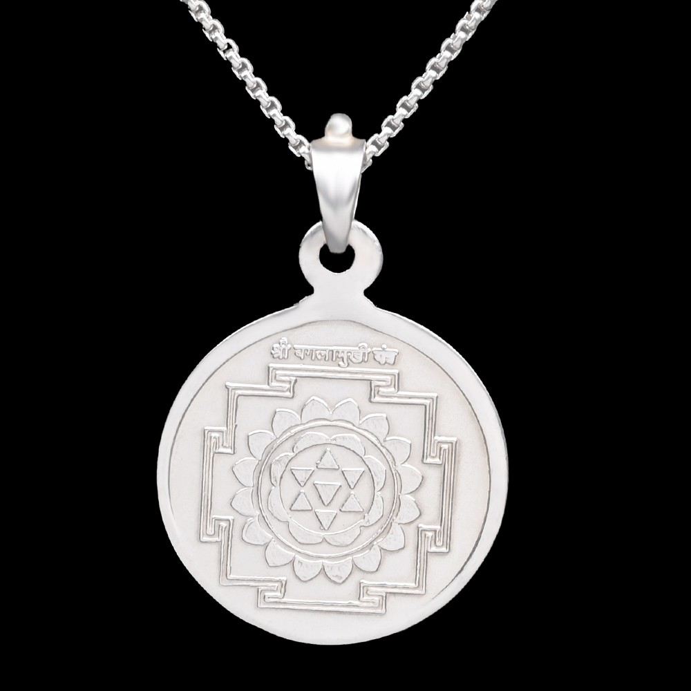This magnificent pure silver locket has powerful Baglamukhi Yantra embossed on one side and Goddess image on other side for blessing the wearer. Baglamukhi Devi is one of the ten forms of wisdom goddess Mahavaidyas, Who is known to remove devotee's misconceptions and illusions resulting to spiritual progress and ultimately helps attain salvation.