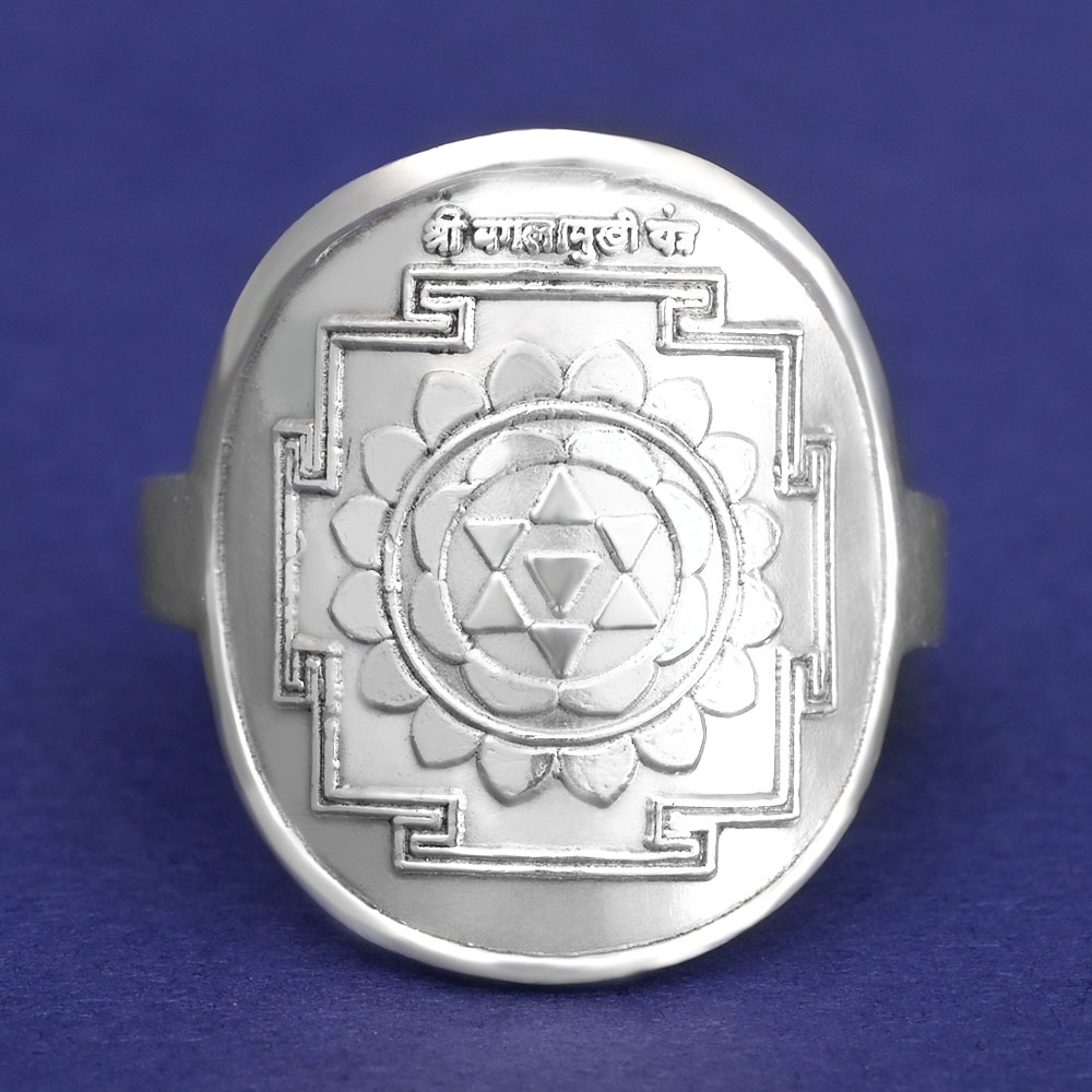 Sparkling Shree Baglamukhi Yantra Ring in Silver meticulously crafted in sterling silver, this ring beautifully displays the revered yantra, which invokes the blessings of Baglamukhi Devi. This blessed and energized ring has Shree Baglamukhi Yantra on top and an image of goddess Baglamukhi on the inside. This yantra bestows power and dominance over enemies. Baglamukhi Yantra is a very powerful and useful Yantra for victory over opponents, and success in quarrels and competitions. It is believed that meditating on or worshiping the Baglamukhi Yantra can aid in controlling and subduing one's enemies, expelling negative energies, winning legal disputes, and overcoming obstacles.