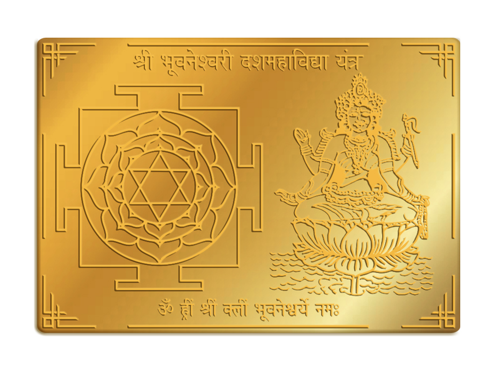 Blessed and energized Shree Bhuvneshwari Dusmahavidya Yantra, crafted in premium quality heavy Brass with Gold Finish, measuring 5 (W) x 3.5 (H) inches, with the option of a wooden frame or stand. This sacred Yantra embodies the energies of Goddess Bhuvneshwari, the fourth of the ten Mahavidyas, offering protection, victory, and relief from life's challenges. It aids in overcoming obstacles, enhances confidence, and promotes overall well-being. Regular worship attracts success, prosperity, and spiritual growth.