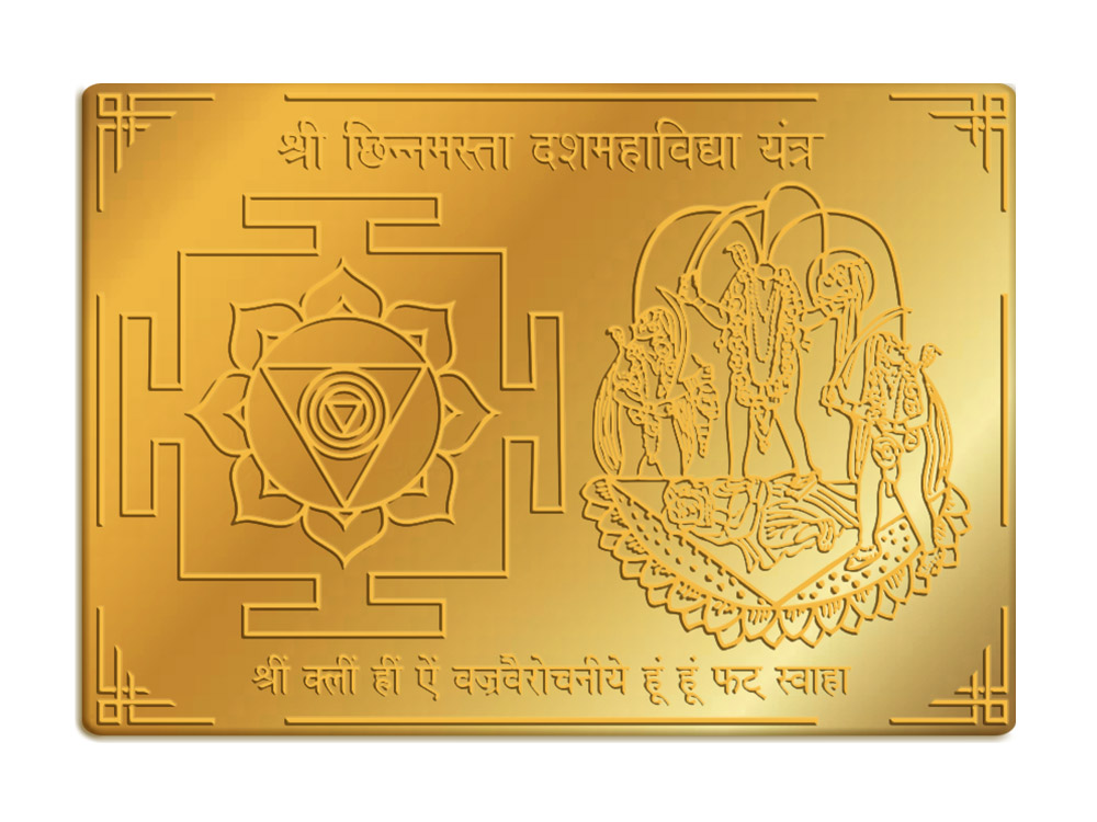 Blessed and energized Shree Chinnamasta Dusmahavidya Yantra, crafted in premium quality heavy Brass with Gold Finish, measuring 5 (W) x 3.5 (H) inches, with the option of a wooden frame or stand. This sacred Yantra embodies the energies of Goddess Chinnamasta, the sixth of the ten Mahavidyas, offering blessings of transformation, empowerment, and liberation. It aids in overcoming obstacles, enhancing inner strength, and promoting spiritual growth. Regular worship attracts divine grace and shields from malefic influences.