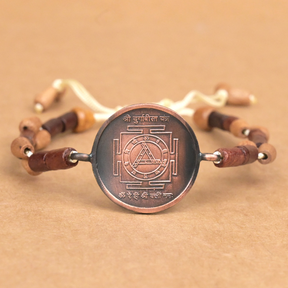 The Durga Bisa Yantra in Copper has the Yantra perfectly and neatly etched on a round copper coin which is slightly curved to fit the wrist. The image of Goddess Durga is etched with precision on the reverse side of the Yantra designed to touch the skin when worn. The Bracelet is strung in an adjustable thread with wooden beads of cylindrical and round shapes that make this Bracelet more appealing.
