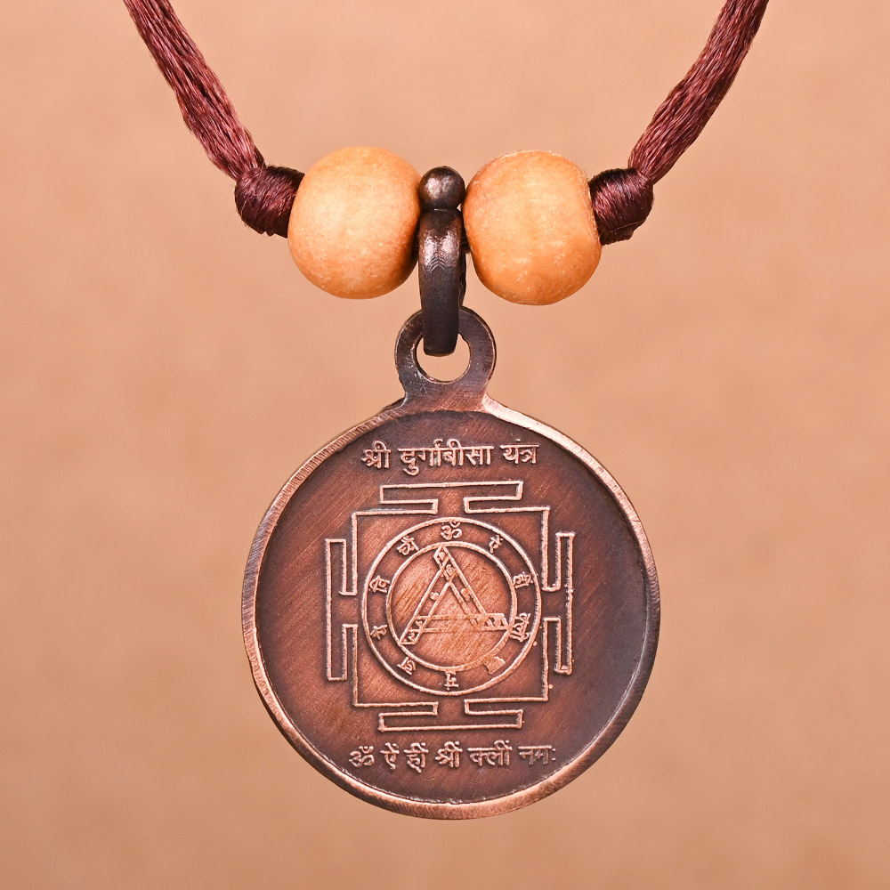 This copper locket with antique finish has sacred Durga Bisa Yantra embossed one side and Goddess Durga image on the other side for divine blessings and protection. This Yantra is considered good for business professionals as it removes all problems in the way of success and attracts prosperity. The Yantra is highly beneficial when worn as pendant or locket.