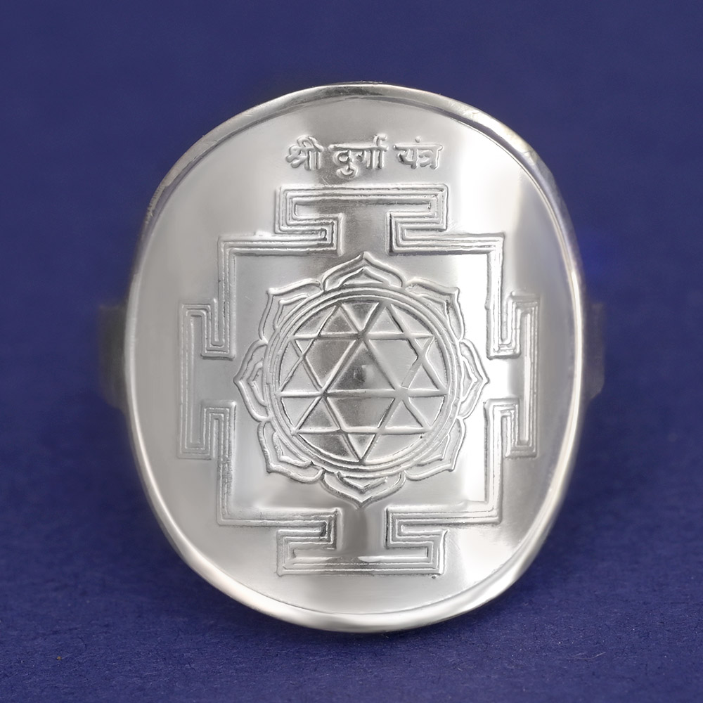 Superb Shree Durga Yantra Ring in Silver meticulously crafted in sterling silver, this ring beautifully displays the revered yantra, which invokes the blessings of mother Durga. This blessed and energized ring has Shre Durga Yantra on top and an image of Durga Devi on the inside. Those who wear this yantra praise its power to bestow strength, courage, and protection. The Yantra's intricate design is believed to harness the divine energy of Mother Durga, fostering harmony and protecting against negative influences. Worship of this Shree Durga Yantra as per Adhayaya 4 sloka 17 of Durga Saptashati removes poverty.