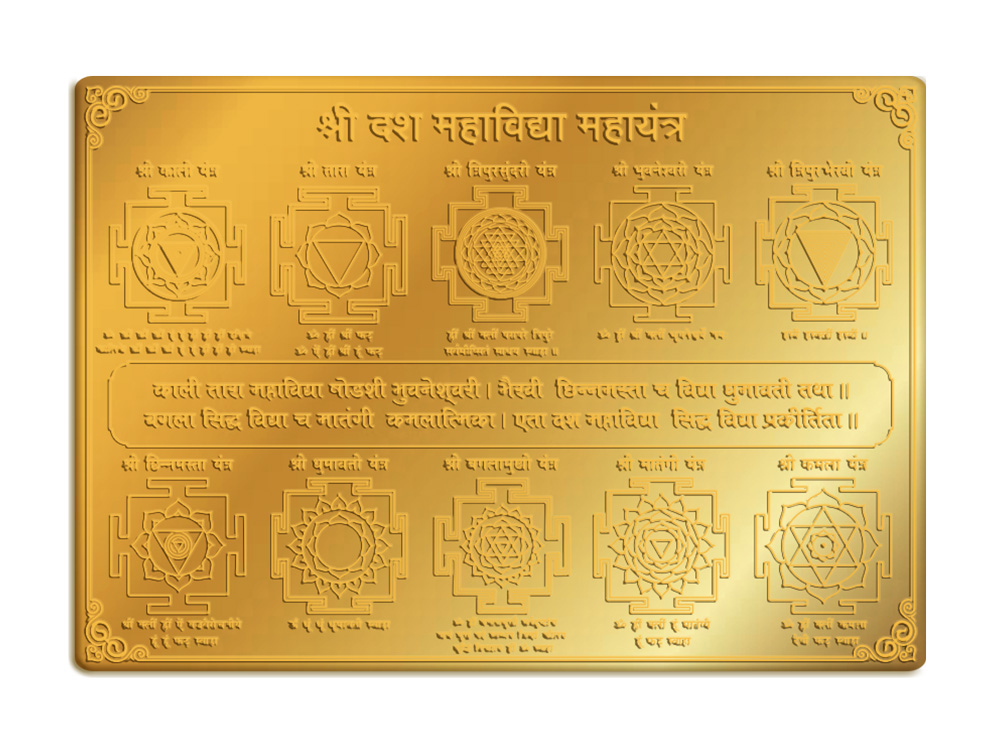Blessed and energized Shree Dus Mahavidya Maha Yantra, crafted in premium quality heavy Brass with Gold Finish, dimension 5 (W) x 3.5 (H) inches. Offers frame or stand options. Yantra represents the ten Great Wisdom Goddesses (Devis): Kali, Tara, Tripura Sundari, Bhuvaneshvari, Bhairavi, Chinnamasta, Dhumavati, Bagalamukhi, Matangi, Kamala. It consolidates their divine abilities, guiding towards spiritual awakening, protection, and holistic well-being.