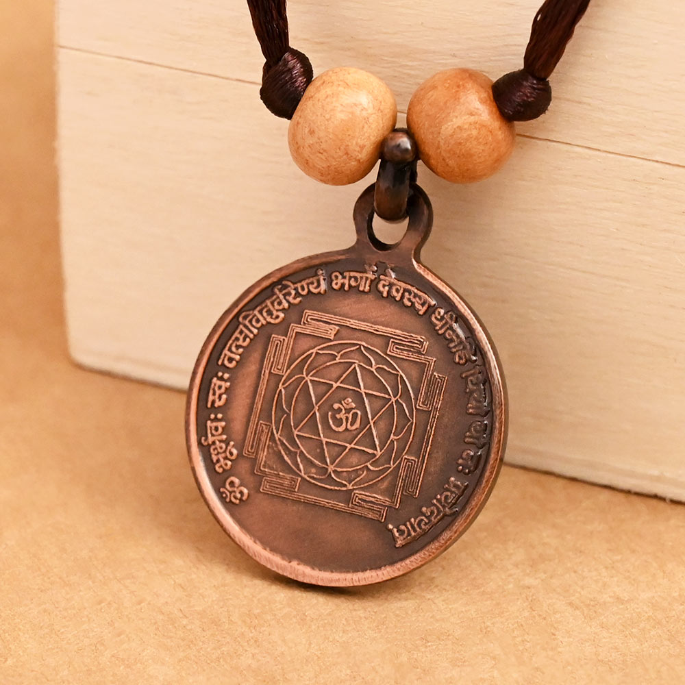 This magnificent locket made of copper with antique finish has Shree Gayatri Yantra on one side and elegant image of Gayatri Devi on other side to bless the wearer. This Yantra is empowered with the power of Goddess Gayatri and Her mantra for enhancing good fortune.