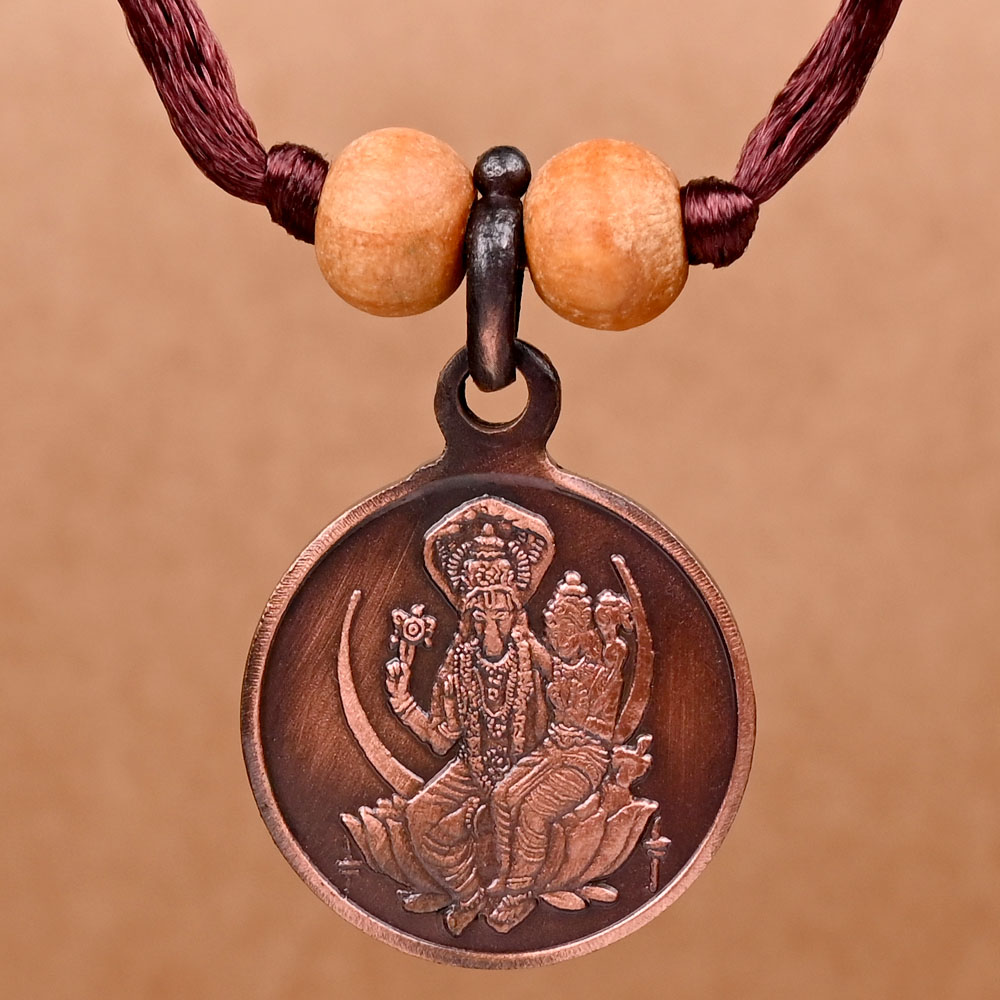 This divine looking copper locket with antique finish has perfectly etched Shree Hayagreeva Yantra on one side and image of VishnuLaxmi on other side. Lord Hayagreeva is a lesser known avatar of Lord Vishnu. Lord Hayagreeva has the head of a Horse and the body of Lord Vishnu. He is worshipped for blessings of intelligence, knowledge, education. It is said, chanting the 108 names of Lord Hayagreeva helps to increase memory power. Legend has it that He is the Guru of Goddess Sarawati, the Goddess of education and knowledge.