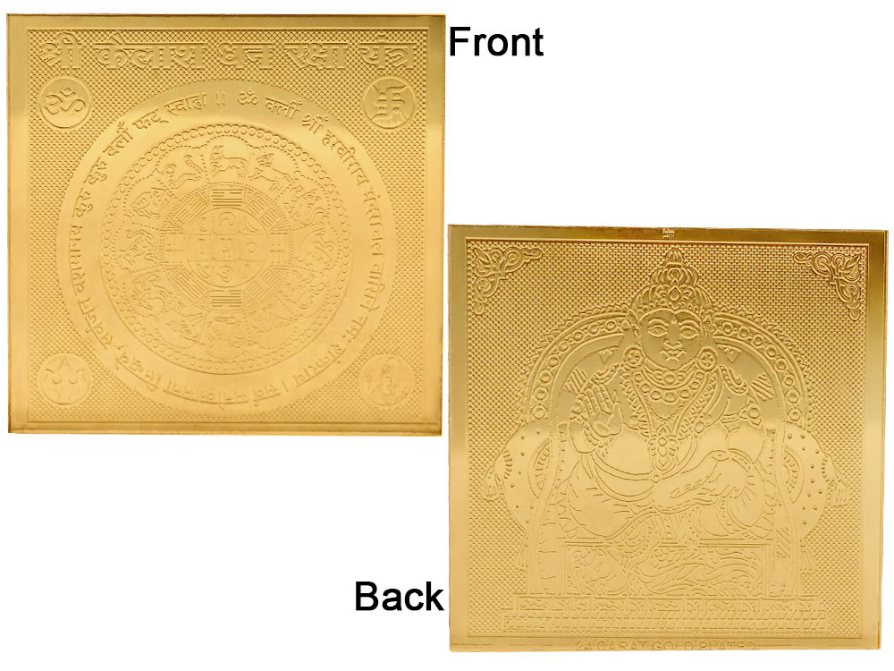 A beautifully crafted Kailash Dhan Raksha Yantra, delicately carved on a copper plate and adorned with a gold finish. This small Yantra features a Kuber image on the back side, making it perfect to carry in your pocket or money purse, or to place on your puja altar, work desk, or shop. The Kailash dhanraksha Yantra offers a sense of opulence and safeguards against any form of negativity or hardship.
