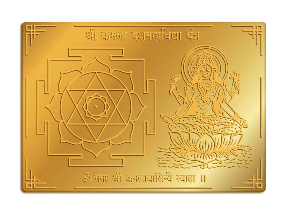 Blessed and energized Shree Kamala Dusmahavidya Yantra, crafted in premium quality heavy Brass with Gold Finish, measuring 5 (W) x 3.5 (H) inches, with the option of a wooden frame or stand. This sacred Yantra embodies the energies of Goddess Kamala, the tenth of the ten Mahavidyas, offering blessings of prosperity, success, and wealth. It aids in overcoming poverty, debts, difficulties, ill-health, and dangers, bringing bliss and mental and spiritual contentment.