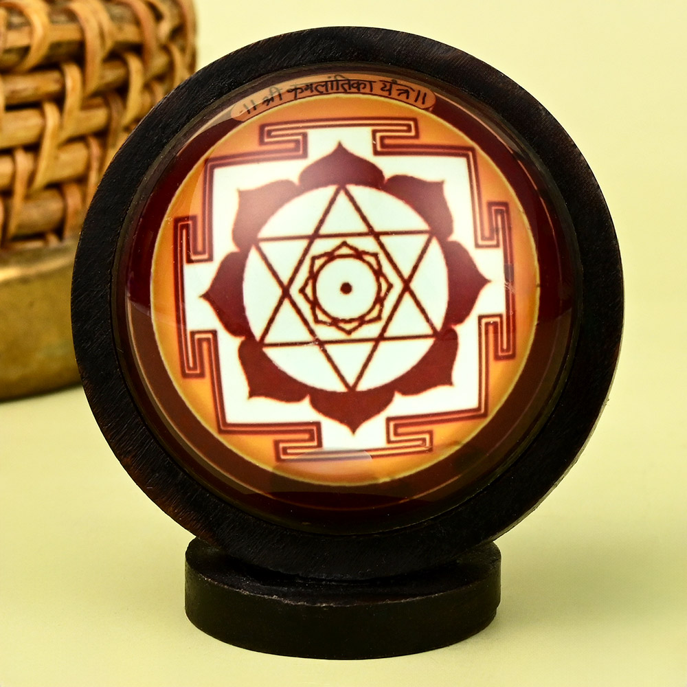 Design: Yantra framed in thick heavy wooden frame on a crystal glass that allows magnified view . Ideal to be placed on table or a gift to your loved ones .