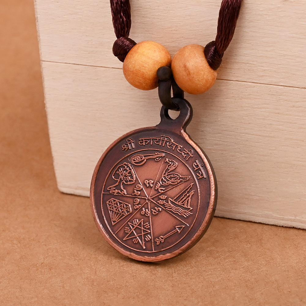 This powerful locket made in copper with antique finish has Shree Karya siddhi Yantra embossed one side and mantra inscription on other side. This Yantra encompasses a circle separated into seven equal segments. Each segment represents different spheres of life.