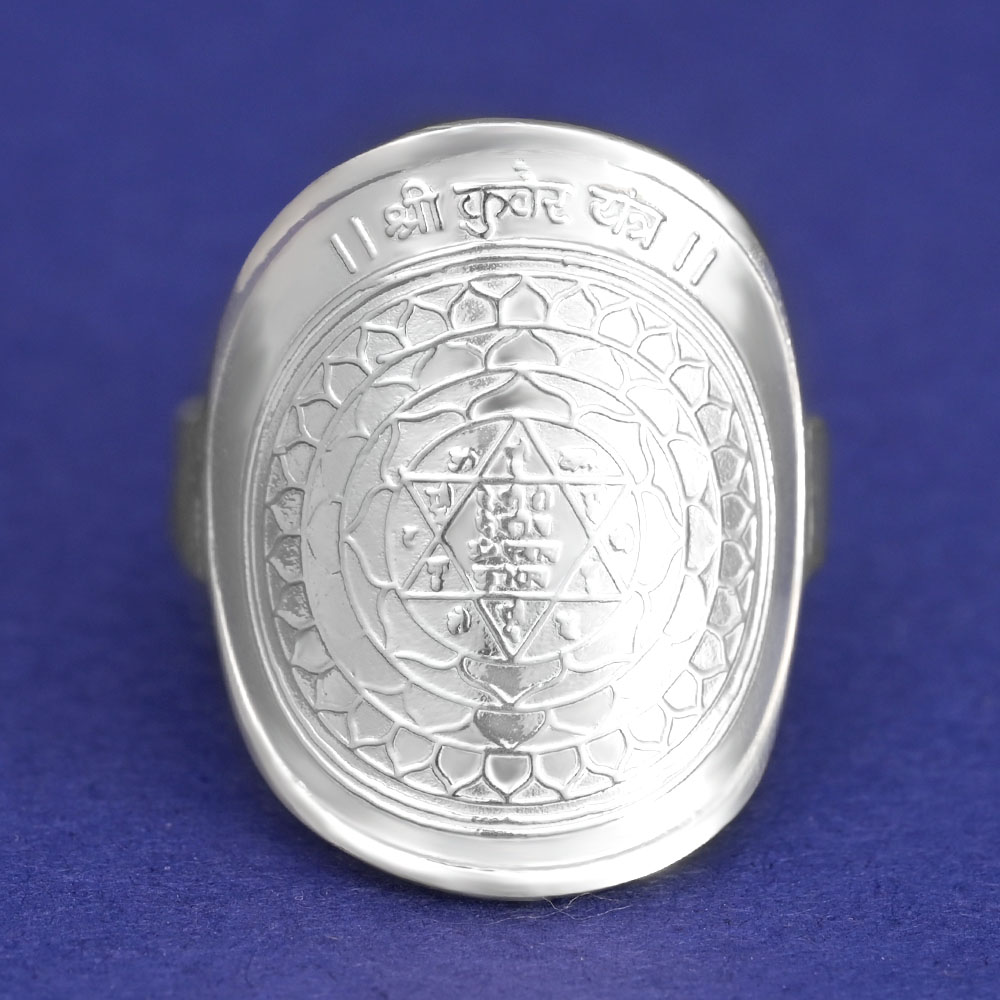 Sparkling Shree Kuber Yantra Ring in Silver meticulously crafted in sterling silver, this ring beautifully displays the revered yantra, which invokes the blessings of Bhagawan Kubera. This blessed and energized ring has Shree Kuber Yantra on top and an image of Bhagavan Kuber on the inside. This yantra blesses the worshipper with money and prosperity by drawing new avenues and sources of income and wealth. It helps increase the flow of funds and the ability to accumulate wealth. The worship of this yantra is recommended for growth in business, career, or professional advancement. Read More
