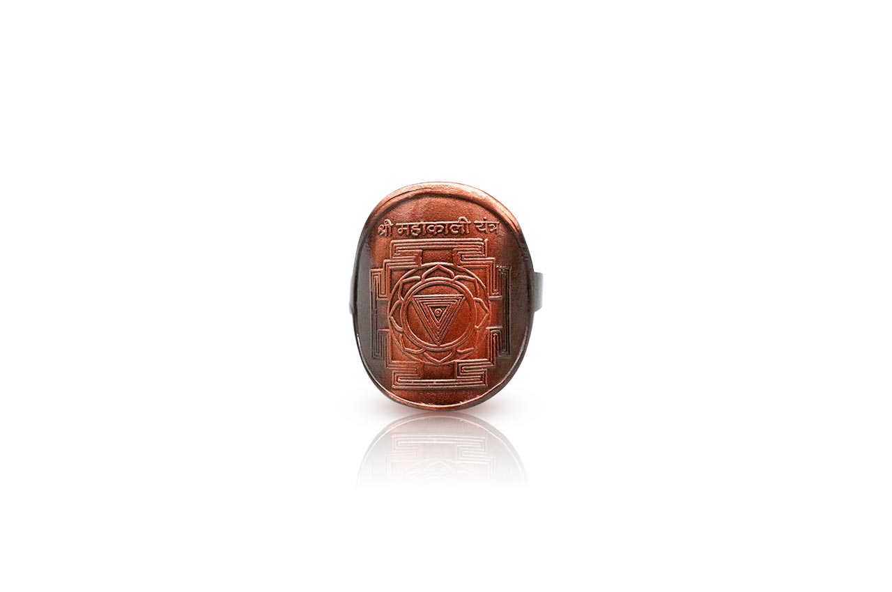 Stylish Shree Mahakali Ring in copper meticulously crafted in an antique finish, this ring beautifully displays the revered yantra, which invokes the blessings of goddess Shree Mahakali. This blessed and energized ring has Shree Mahakali Yantra on top and an image of Kali Devi on the inside. Mahakali, the Dark Mother, is a deity with whom devotees share a profound and affectionate connection, despite Her fearful appearance. In this relationship, the devotee becomes a child, while Kali takes on the role of the ever-caring mother. This is a yantra designed and intended to safeguard against black magic, negative impacts of the planets Saturn and Rahu, and evil influences.