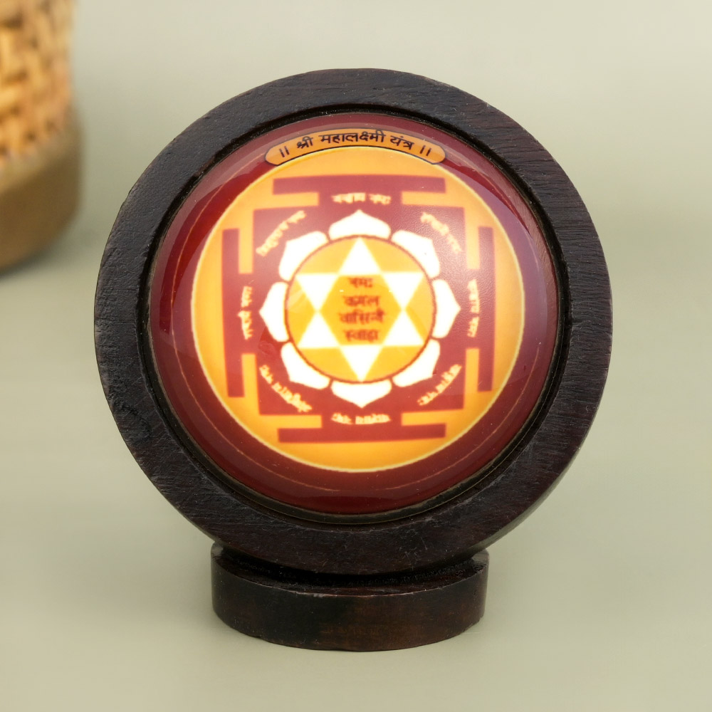 Design: Yantra framed in thick heavy wooden frame on a crystal glass that allows magnified view . Ideal to be placed on table or a gift to your loved ones .
