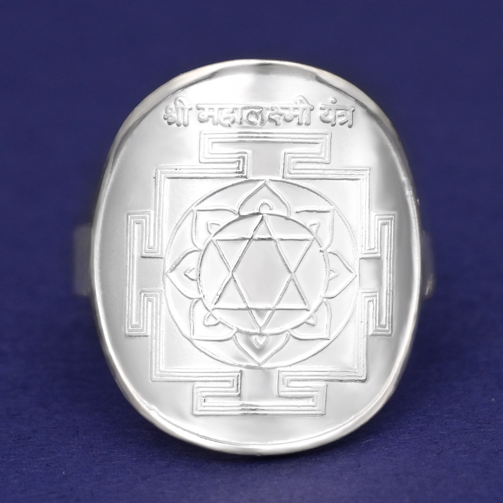 Shining Shree Mahalakshmi Ring in Silver meticulously crafted in sterling silver, this ring beautifully displays the revered yantra, which invokes the blessings of goddess Mahalakshmi. This blessed and energized ring has Shree Mahalakshmi Yantra on top and an image of Lakhsmi Devi on the inside. This yantra bestows wealth, prosperity, and good fortune on the worshipper. All desires are fulfilled by uttering the mantra of Maha Lakshmi, and the worshipper is never lacking in money or material comforts; his house and treasury are always full, and he and his family never face a shortage of resources.