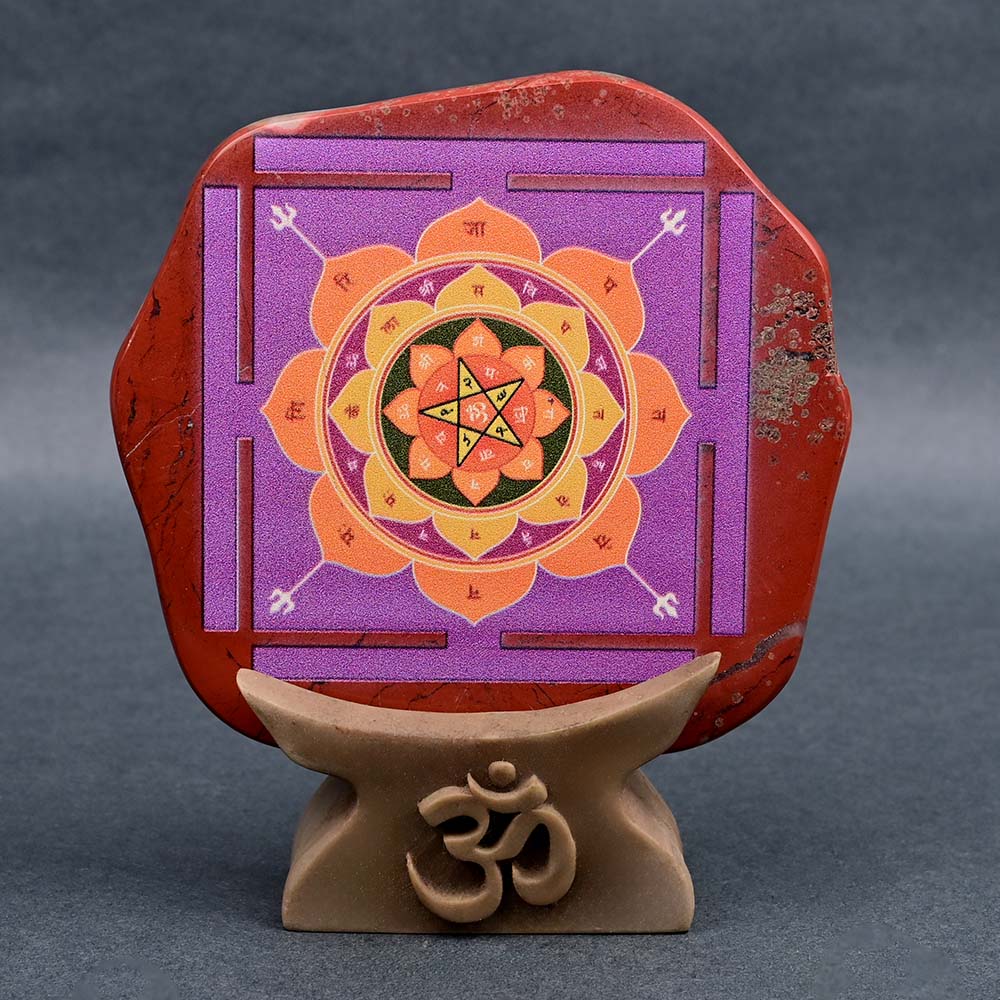 Shree Maha Mrithyunjay Yantra elegantly printed on Natural Red jasper gemstone. The coloured Yantra image made of UV print is washable and long-lasting. It is placed on elegant stand with embossing of the sacred mantra ‘Om’ to support the Yantra and allow it to be full visible. The auspicious Yantra can be placed in your puja altar, living area or work desk. Red jasper gemstone has properties of providing good health, stamina, focus, vitality, stability, strength and alertness. The combination of Shree Maha Mrithyunjay Yantra and Red jasper provides good fortune, good health, valour and relief from fear of death, diseases and mishaps and also removes miseries and difficulties from life. The Yantra plate along with the stand is packed in beautiful satin gift box with a label describing the benefits of the Yantra.