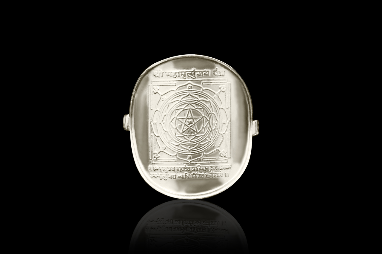 Sparkling Shree Mahamrityunjaya Ring in Silver meticulously crafted in sterling silver, this ring beautifully displays the revered yantra, which invokes the blessings of Mahamrityunjaya Shiva. This blessed and energized ring has Shree Mahamrityunjaya Yantra on top and an image of Bhagawan Shiva on the inside. This yantra bestows health, happiness, good fortune, and protection. It dispels anxieties, phobias, fears, ill effects of malefic planets, ghosts, diseases and accidental or untimely death. The holy water after the puja of this yantra, may be sprinkled around the home for auspiciousness and for keeping away diseases and other calamities.
