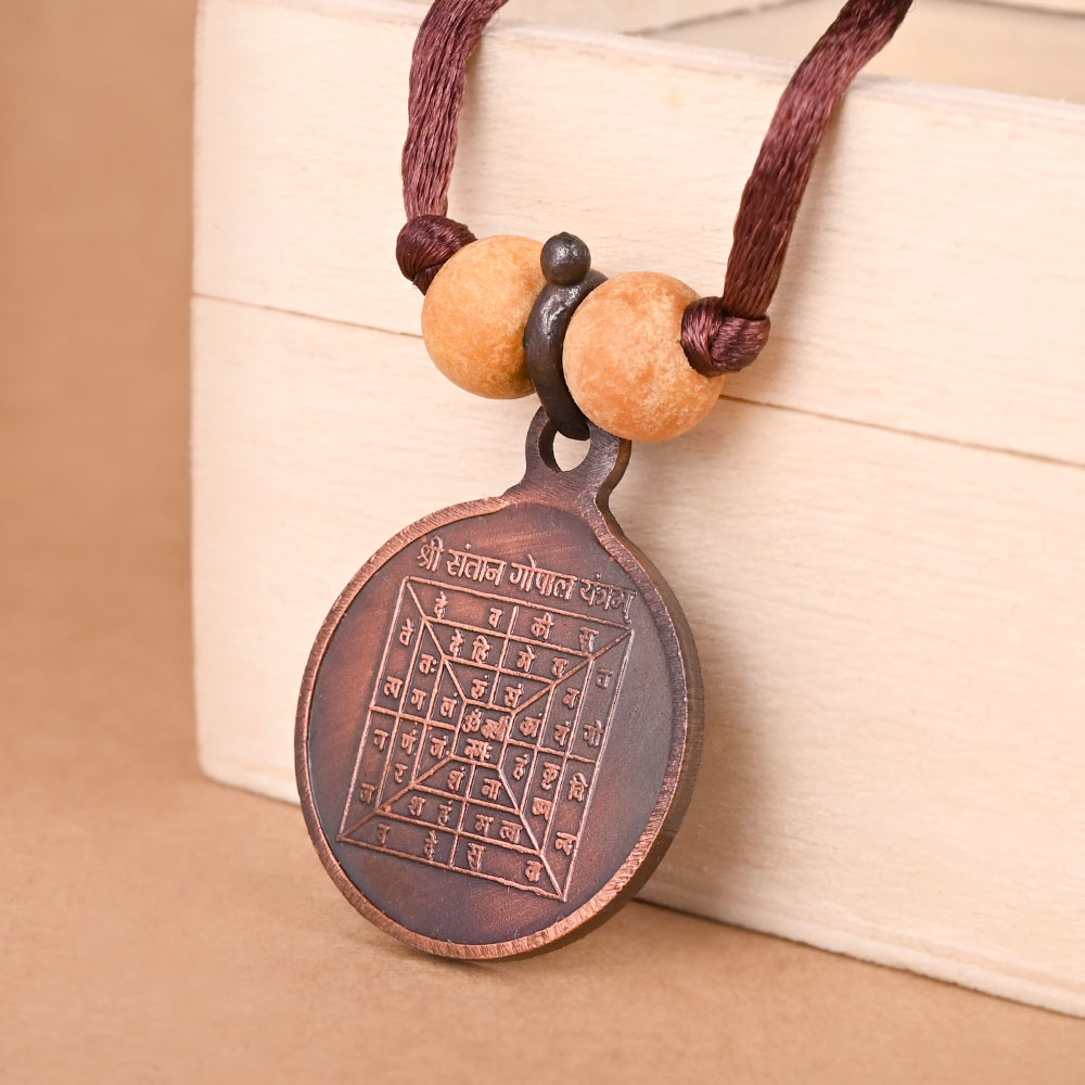This magnificent looking tarnished copper locket with impeccably embossed Santan Gopal Yantra on front side and image of Santan Gopal with pot of curd on back side. Santan Gopal Yantra represents the infant form or Lord Krishna, Who survived through many adversaries and spread happiness through His Leelas, similarly the Yantra bestows joy and liveliness in form of progeny and spiritual progress.