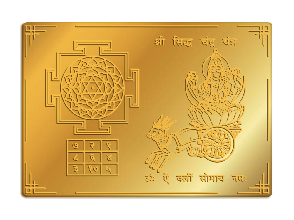 Blessed and energized Shree Siddh Chandra Yantra, crafted in premium quality heavy Brass with Gold Finish, measuring 5 (W) x 3.5 (H) inches, with the option of a wooden frame or stand. This sacred Yantra embodies the divine energies of Bhagwan Chandra (Moon God), bringing calmness, emotional balance, intuition, and mental clarity. It enhances peace of mind, emotional stability, and sensitivity, while fostering creativity, wisdom, and harmonious relationships. Regular worship pacifies malefic effects of a weak Moon in the horoscope and attracts positivity, prosperity, and spiritual growth.