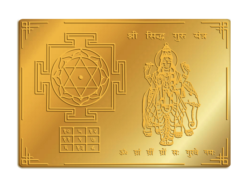 Blessed and energized Shree Siddh Guru Yantra, crafted in premium quality heavy Brass with Gold Finish, measuring 5 (W) x 3.5 (H) inches, with the option of a wooden frame or stand. This sacred Yantra embodies the energies of Bhagwan Brihaspati (Jupiter), offering prosperity, intelligence, and divine protection. It aids in overcoming obstacles, enhances spiritual growth, and strengthens virtue in every sphere of life. Regular worship pacifies malefic effects of Jupiter in the horoscope and attracts success and abundance.