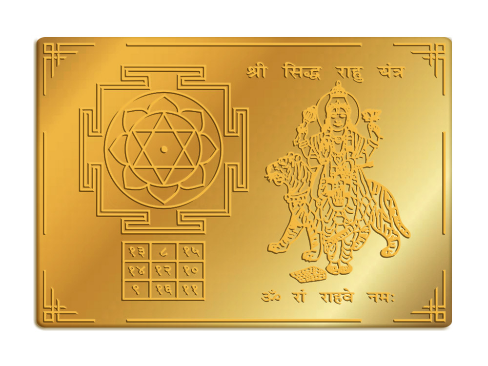 Blessed and energized Shree Siddh Rahu Yantra, crafted in premium quality heavy Brass with Gold Finish, measuring 5 (W) x 3.5 (H) inches, with the option of a wooden frame or stand. This sacred Yantra embodies the divine energies of Bhagwan Rahu, offering protection from hidden adversaries, accidents, and negative energies. It enhances mental clarity, focus, and intuition, while accelerating progress toward life goals. Regular worship pacifies malefic effects of Rahu in the horoscope and attracts prosperity and success.