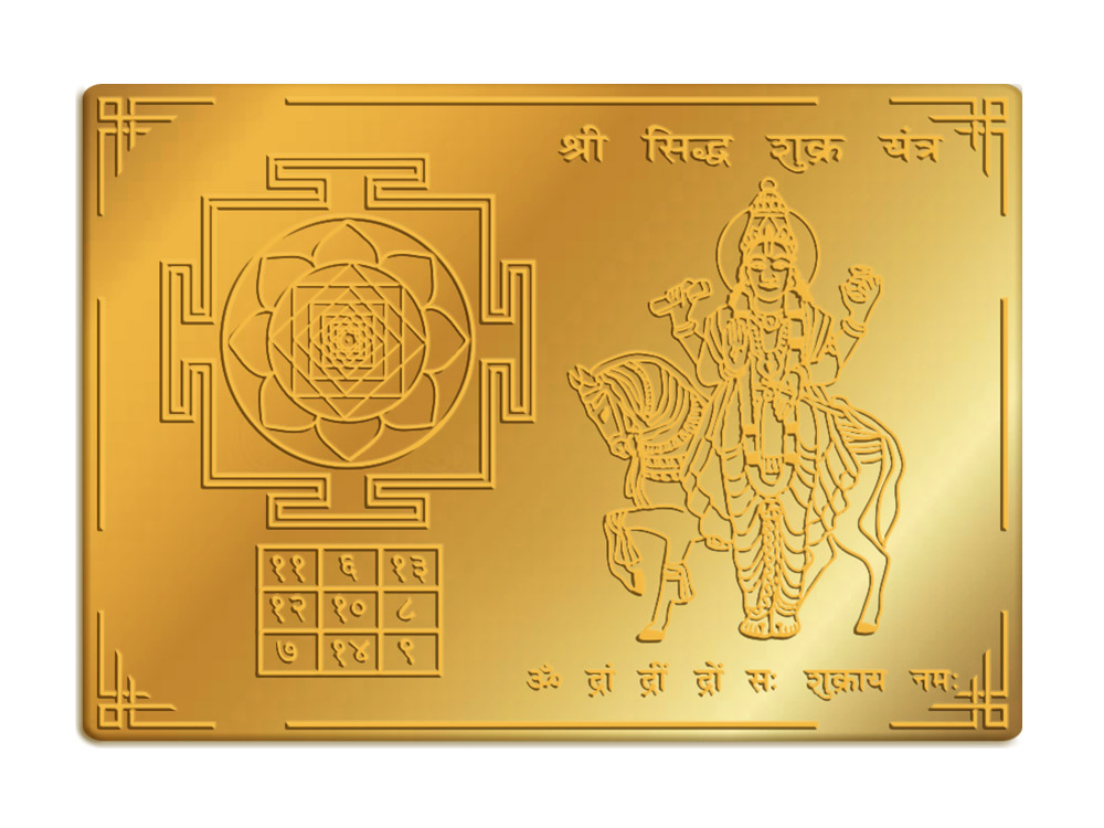 Blessed and energized Shree Siddh Shukra Yantra, crafted in premium quality heavy Brass with Gold Finish, measuring 5 (W) x 3.5 (H) inches, with the option of a wooden frame or stand. This sacred Yantra embodies the energies of Bhagawan Shukra (Venus), enhancing beauty, love, and prosperity. It aids in resolving relationship issues, attracting wealth, and promoting success in arts and media. Regular worship pacifies malefic effects of Venus in the horoscope and attracts success and abundance.