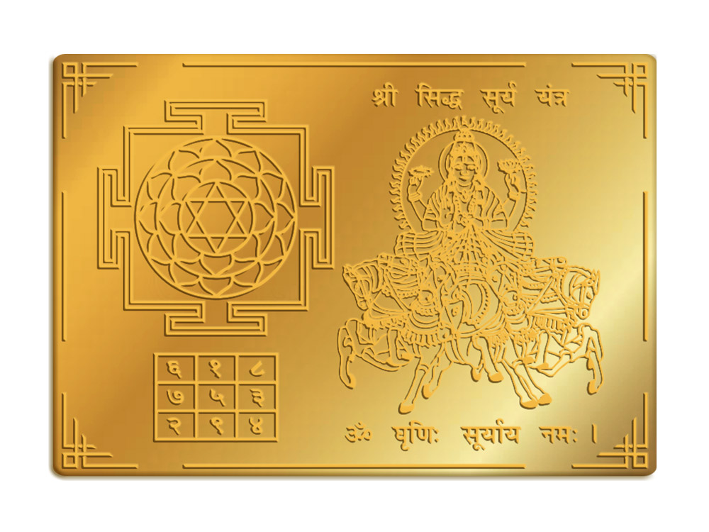 Blessed and energized Surya Yantra, crafted in premium quality heavy Brass with Gold Finish, measuring 5 (W) x 3.5 (H) inches, with the option of a wooden frame or stand. This sacred Yantra embodies the divine energies of Bhagawan Surya (Sun God), blessing the devotee with vitality, brilliance, confidence, and success. It radiates youthful vigor, instills fearless determination, and empowers one to act with clarity and discipline. Surya Yantra enhances self-reliance, dissolves dependency on others, and inspires leadership, courage, and righteous action. By worshipping it regularly, the devotee is blessed with willpower, fame, authority, and prosperity, while the malefic effects of a weak Sun in the horoscope are pacified.