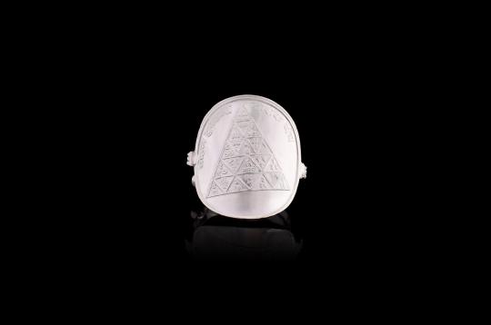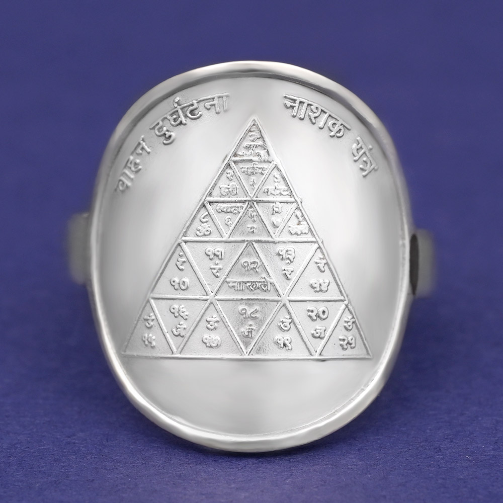 Sparkling Shree Vaahan Durghatna Ring in Silver meticulously crafted in sterling silver, this ring beautifully displays the revered yantra, with the yantra on top and an image of Bhagavan Hanuman sitting with His mace on inside. The term "Vaahan" means "vehicle" and "Durghatna'' means "accident". This yantra ensures protection from accidents, injury or other misfortunes, especially those related to vehicles. This ring is believed to bring blessings from protective deities, ensuring a safe and secure journey for the wearer while traveling.