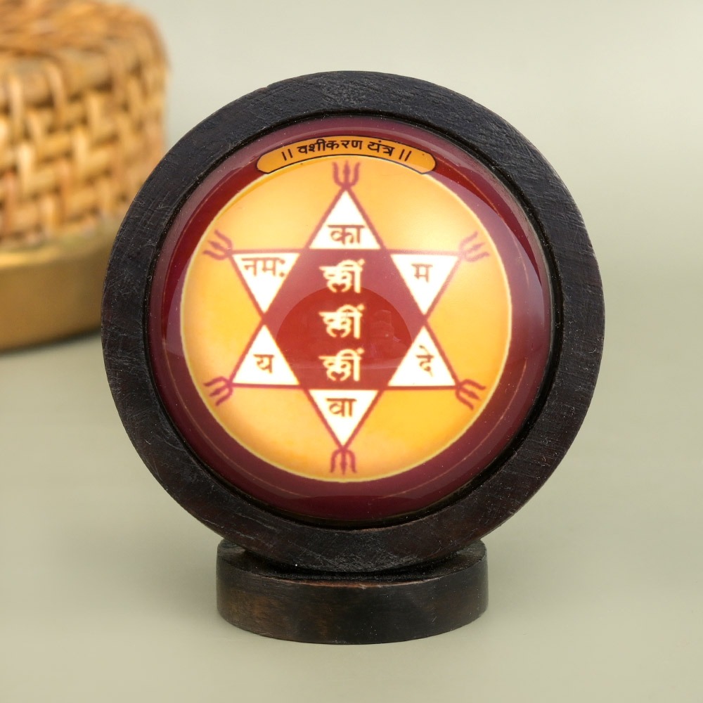 Design: Yantra framed in thick heavy wooden frame on a crystal glass that allows magnified view . An attractive Ideal to be placed on Desktop/Car/and Puja altar or a gift to your loved ones.