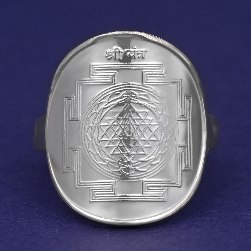 Sparkling Shree Yantra Ring in Silver meticulously crafted in sterling silver, this ring beautifully displays the revered yantra, which bestows totality in life. This blessed and energized ring has Shree Yantra on top and an image of Lakshmi Devi on the inside. Shree Yantra is a diagram of interlocking triangles and lotus which represents the divine energies of all Gods and Goddesses and is believed to carry their potency. In spiritual context, the Yantra is also known to be a cosmic representation of the evolution of humans to God, thus helping an individual achieve prosperity, success and growth in all realms of life. Read more