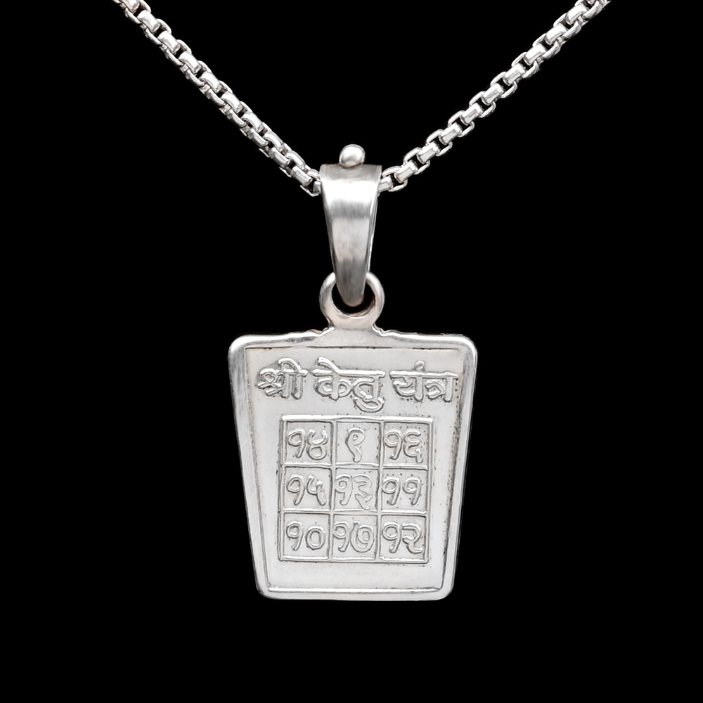 A pure Silver Locket with the Ketu Yantra neatly embossed on one side and Deity image on the other side. Ketu is the south node of Moon, as per Vedic Astrology and a shadow planet. The Ketu Yantra is a set of specific mystical numbers which helps to get relief from ill effects of malefic Ketu in the Kundli/Birth chart of a native. The weak placement of planet Ketu in Natal chart creates multiple problems and obstacles in all aspects of the individual\'s life and causes unhappiness.