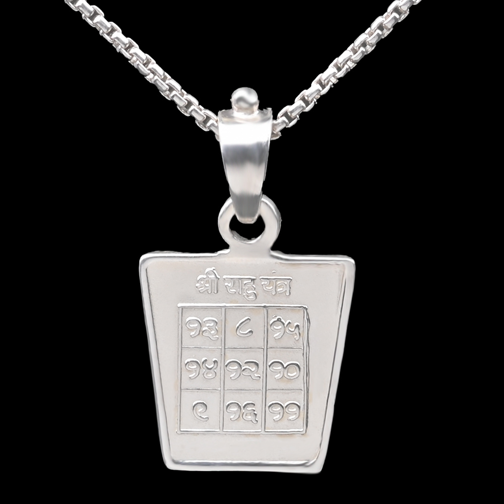 A pure Silver Locket with Rahu Yantra neatly embossed on one side and the Deity image on the other. The Siddh Rahu Yantra is a set of mystical numbers, arranged in a specific way, which resonate with the positive powers and frequencies of planet Rahu and helps to get relief from afflictions of Rahu Dosha. Rahu is the North Node of the Moon, a shadow planet and as per Vedic Astrology, Rahu is a malefic planet which brings hurdles, struggles, financial strife, loss, debts, hidden enemies, sudden disasters, conflicts in relationships, health problems which are difficult to diagnose or are wrongly diagnosed, causes anxiety, stress, trauma, fears, failures in spite of best efforts, delays and makes life seem miserable.