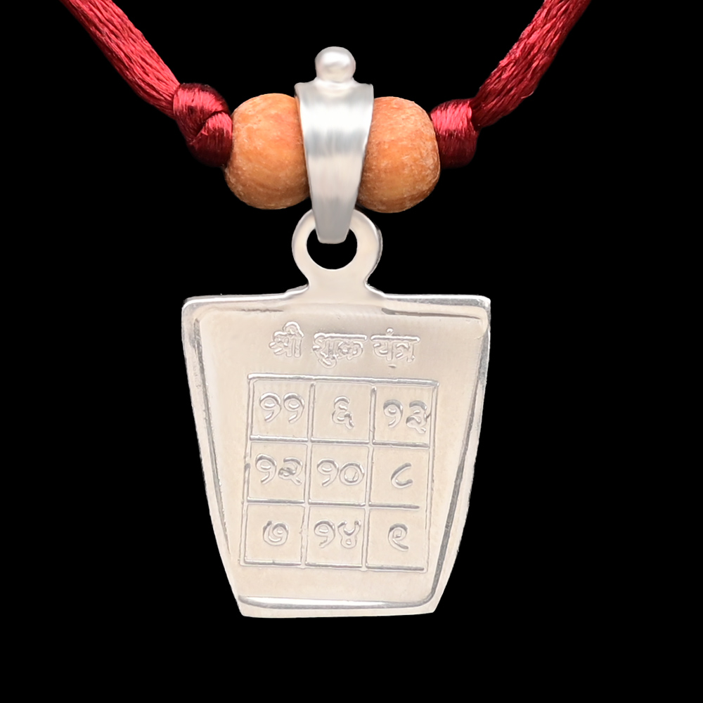 Sparkling Shukra Locket in pure Silver and silk thread with the Siddh Shukra Yantra on one side, and the image of Bhagawan Shukra on the other side. Crafted to capture the energy of Venus, the planet linked to love and wealth. This sacred locket is believed to enhance charm, charisma, and overall attractiveness, promoting love and harmonious relationships, and it enhances financial prosperity and material abundance, making it a perfect companion for those pursuing success in personal and professional pursuits.