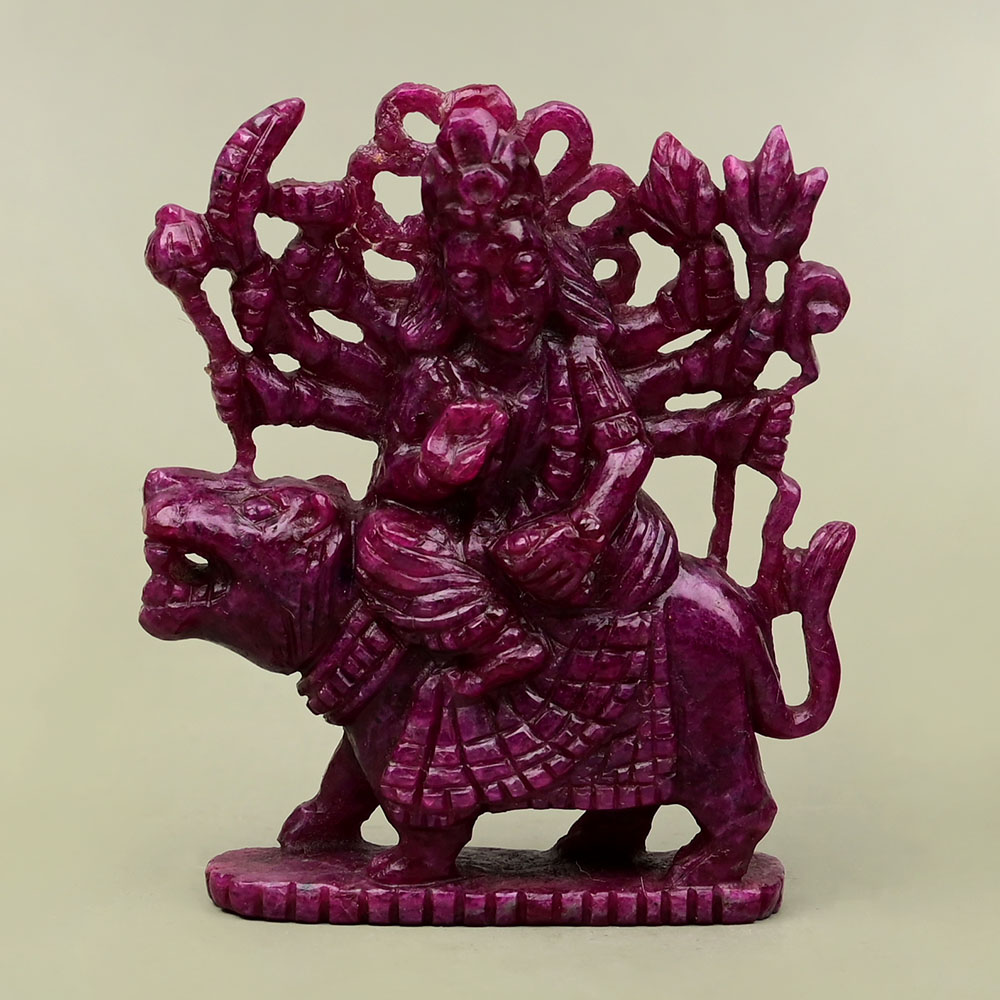 A very finely carved small idol of Goddess Durga in natural Ruby gemstone is ideal to be worn as a locket in gold or silver or placed as it is in your altar or carried in person. The Sword, Trident, Bow and arrow, mace, Lotus, Conch and Chakra held in Her upper arms symbolise eradication of vices, courage, righteousness, devotion, detachment, happiness, and good conduct. Ruby enhances the blessings of Goddess Durga and promotes additional energies of fame, name, leadership, motivation, passion and power.