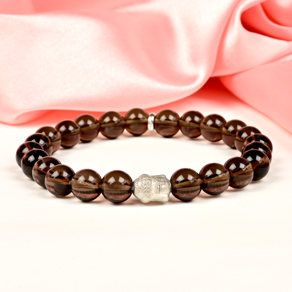 This beautiful Smoky Quartz Buddha Bracelet features round brown Smoky Quartz beads strung on a stretchable elastic thread and adorned with a Buddha charm, blending spiritual elegance with everyday style. Known for its strong connection with the Muladhara (Root) Chakra, Smoky Quartz helps ground energy, dissolve negativity, and promote emotional stability and focus. It enhances balance, clarity, and resilience, supporting the wearer in achieving both personal growth and professional success.
