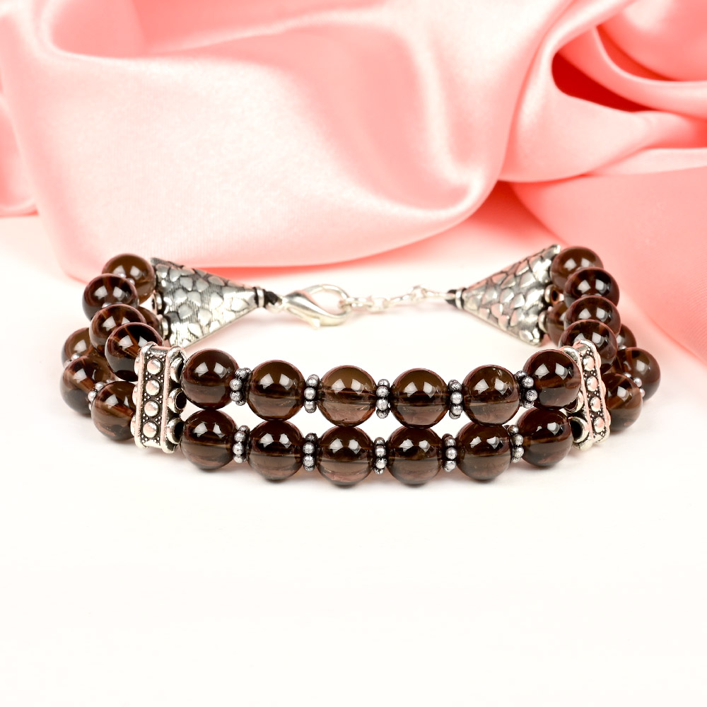 This Smoky Quartz Double Layer German Silver Designer Bracelet is a statement accessory that beautifully blends style with the healing energy of natural gemstones. The bracelet is crafted with two layers of polished round Smoky Quartz beads, arranged symmetrically to create a bold and elegant look. Each bead shimmers with the deep, smoky transparency characteristic of this powerful stone, while the double-strand design adds both strength and sophistication. The two layers are accentuated with finely detailed German silver spacers and designer beads, enhancing the bracelet’s ornamental charm. The ends of the bracelet are adorned with intricately carved German silver cone caps, giving it a royal and traditional touch. The bracelet is secured with a sturdy clasp, ensuring comfort and durability while maintaining its designer appeal. Smoky Quartz is celebrated as a stone of grounding, stability, and protection. It absorbs negative energy, relieves stress, and brings emotional calm. Wearing this bracelet not only enhances your sense of style but also supports inner strength, clarity, and confidence in daily life.