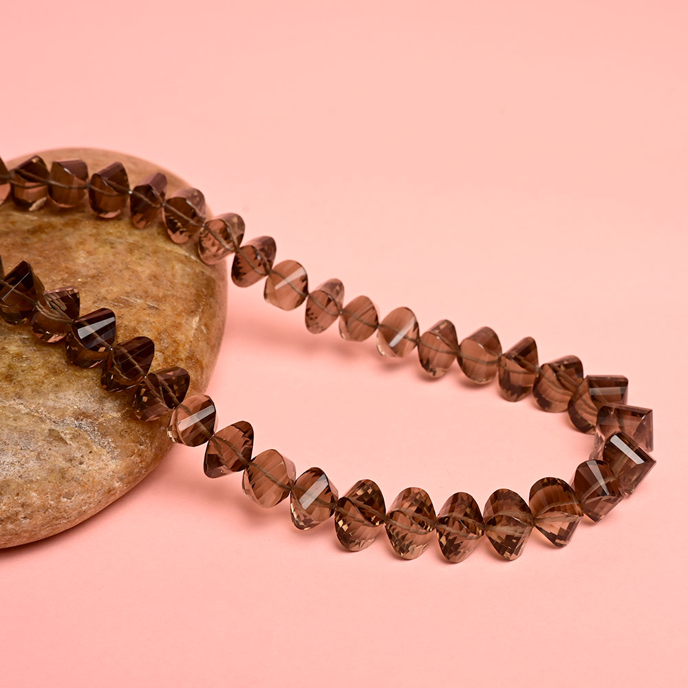 This Smoky Quartz Necklace is potent in grounding energies and for protection, is strung with faceted button shaped beads of natural Smoky Quartz Gemstone. This gemstone strengthens the connection with the earth and keeps one centred, rooted in the present. It forms a protective shield around the wearer, transmutes negative energies into positive, helps to release stress, grief or overwhelming feelings.