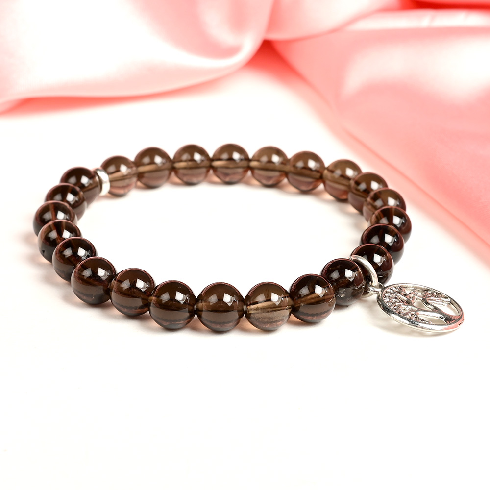 This Smoky Quartz Life of Tree Bracelet is thoughtfully crafted with polished smoky quartz beads, beautifully complemented by a silver-toned Tree of Life charm. The beads, with their deep smoky-brown hues, exude elegance and grounding energy, while the symbolic charm adds spiritual depth and meaning. Strung on a durable elastic cord, the bracelet is easy to wear and suits both casual and formal occasions, making it a versatile accessory with timeless appeal. Smoky Quartz is revered as a stone of grounding, protection, and emotional balance. It dispels negativity, reduces stress, and enhances focus, while aligning the Root Chakra to create stability and inner strength. The Tree of Life charm represents growth, wisdom, and interconnectedness, symbolizing the balance between earthly grounding and spiritual expansion. Together, this bracelet becomes a powerful talisman of strength, renewal, and harmony, perfect for those seeking balance and deeper connection in their life’s journey.