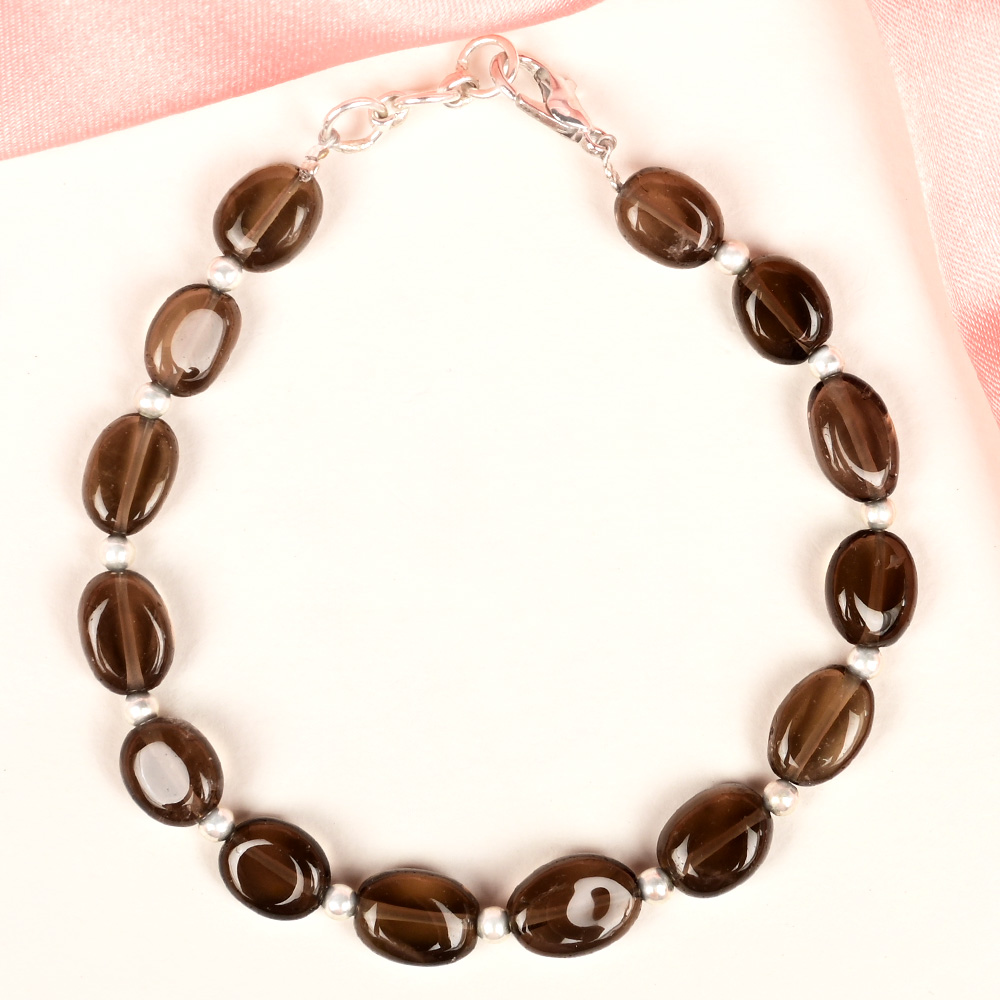 This bracelet is made of smooth oval Smoky Quartz beads alternated with German silver ball spacers and secured with a clasp. It combines elegance and spiritual strength, perfect for meditation or daily wear. Smoky Quartz grounds energy, removes negativity, and enhances focus, clarity, and emotional balance. It brings stability and harmony, supporting a calm and centered state of mind.