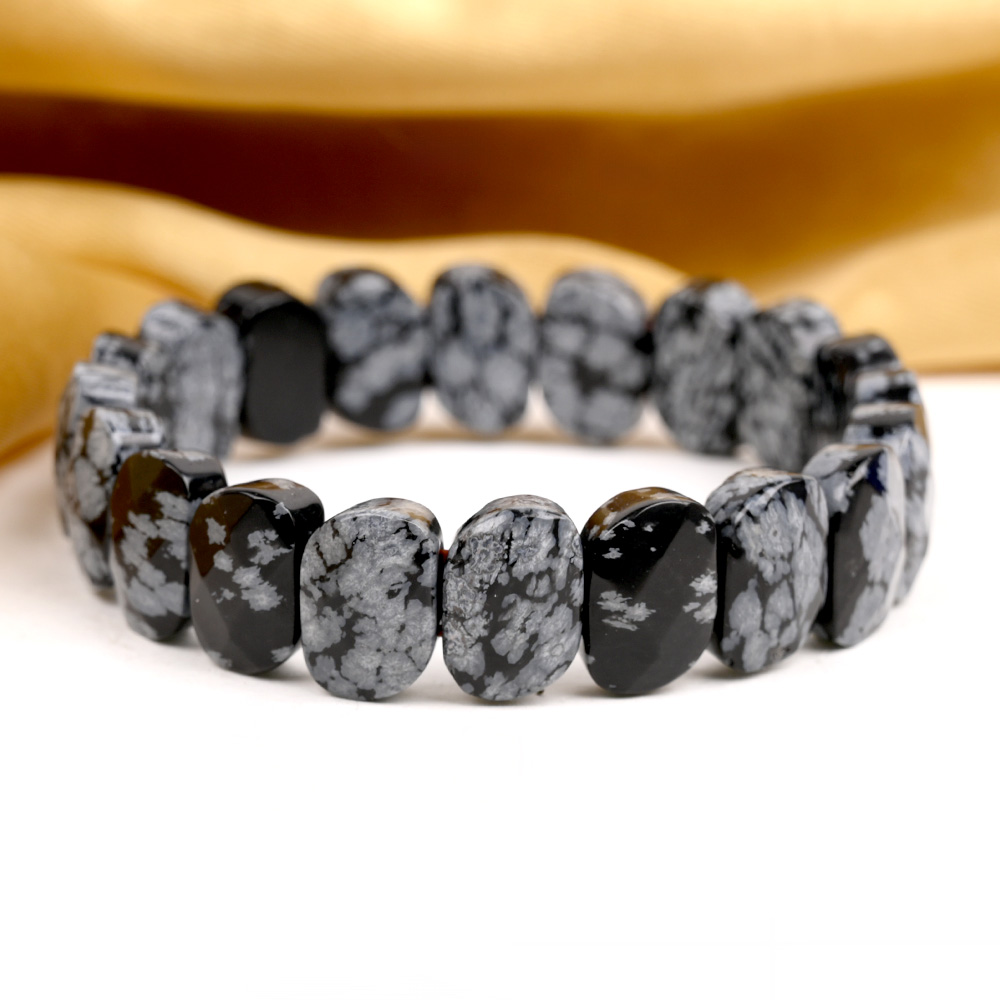 This Snowflake Bracelet features faceted rhomboid-shaped beads in deep black tones with natural grey snowflake-like patterns. Each bead shows unique markings that highlight the natural character of the stone. The bracelet is strung securely to create a bold and structured design suitable for daily wear.
