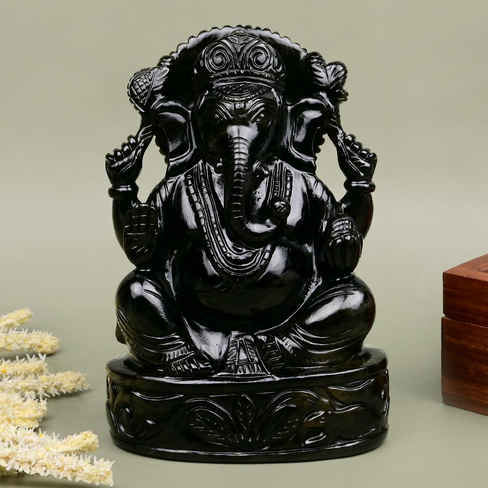 Lord of new beginnings - Lord Ganesha seated on dice is intricately crafted in natural snowflake obsidian gemstone. The detailed craftsmanship beautifully illustrates ornaments or Lord and floral inscription on dice. Lord is holding His divine weapons in His upper arms and modak in lower left hand and has right hand in blessing pose. The combination of Lord Ganesh and snowflake obsidian gemstone provides wisdom, intelligence, balance, harmony, protection from negativity and removes obstacles from life. Place the radiant Idol in your puja room on near house entrance.