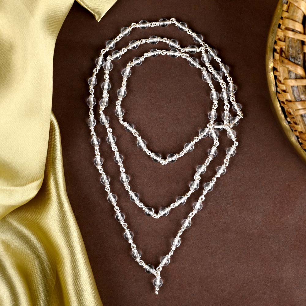 This mala is made with high-quality, polished premium Sphatik (crystal quartz) beads, strung together with precision on 925 sterling silver wire. The beads are smooth, flawless and glossy, reflecting light beautifully, and each bead is separated by delicate silver spacers, giving it a refined and elegant look. The mala is completed with a matching white and golden tassel, adding a touch of purity to the design.