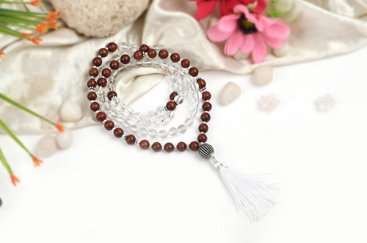 Mala characterized by shimmering gleam of Sphatik paired with calming red Rosewood beads makes a matching accessory for all clothing.