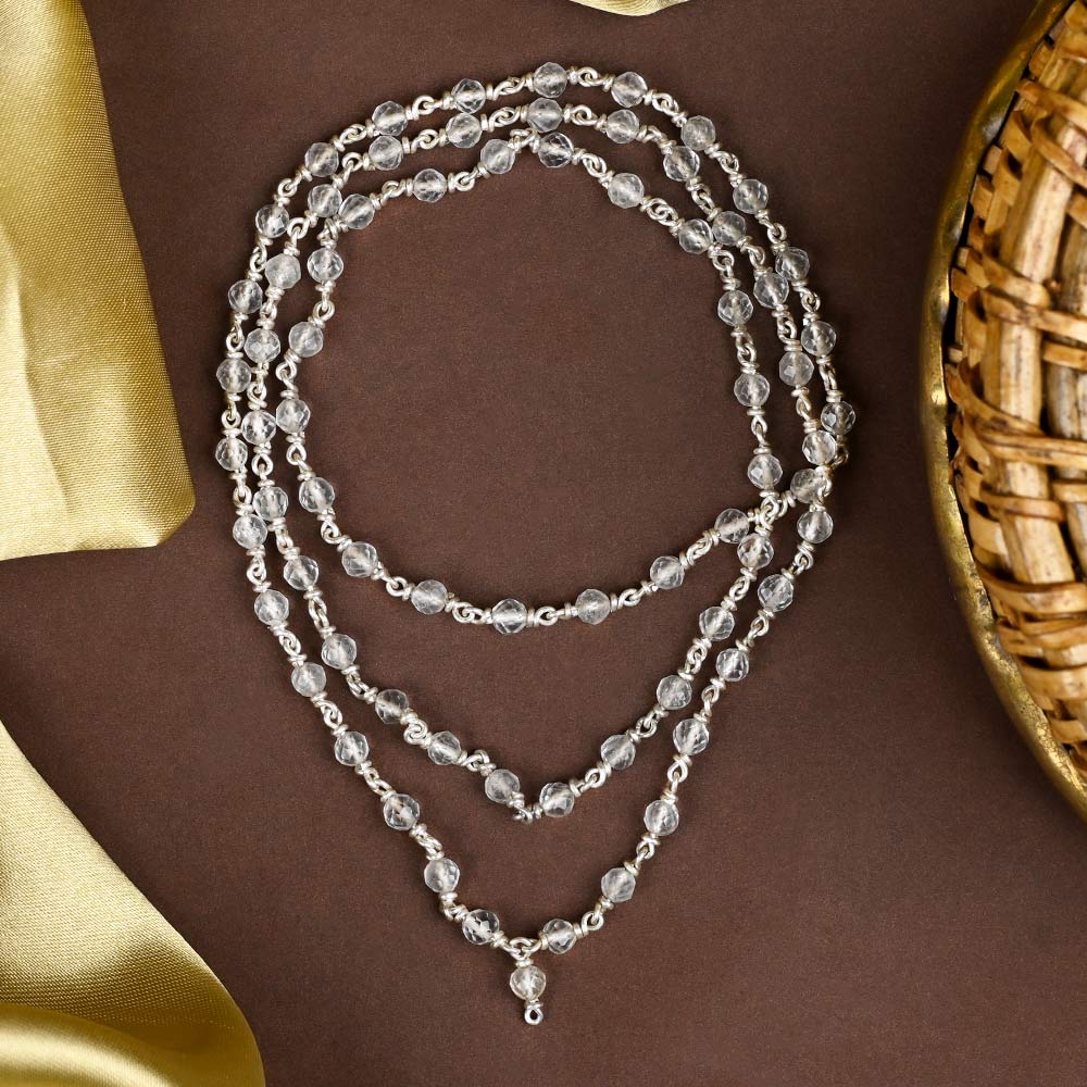 Sphatik (crystal quartz) is cherished for its ability to purify energy, calm the mind, and improve focus during meditation and mantra chanting. The sterling silver wire not only adds durability but also amplifies the spiritual vibrations of the mala, making it ideal for both spiritual practice and elegant wear.