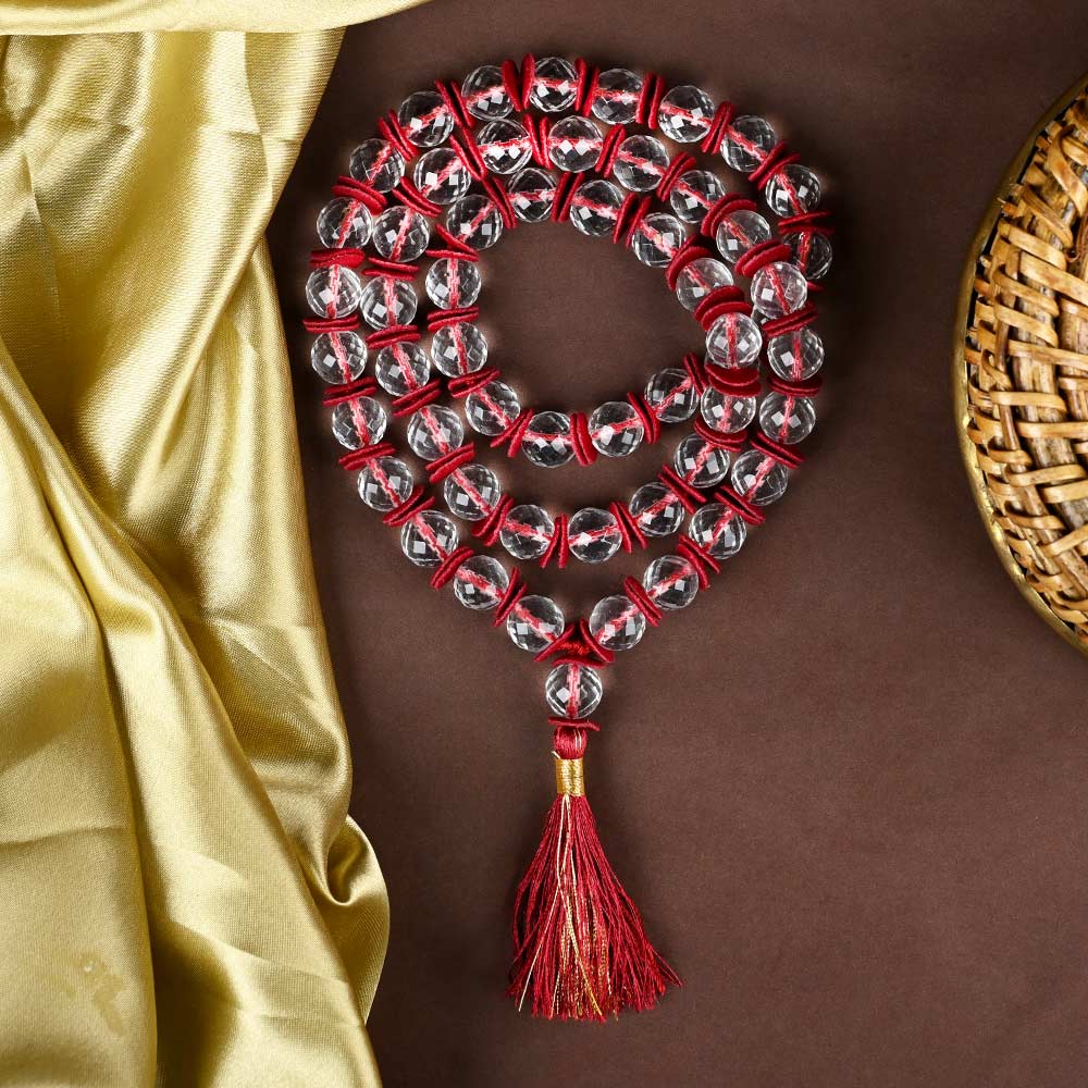 Faceted Sphatik beads are known to amplify spiritual vibrations, increase concentration, and bring mental clarity. The facets further enhance the natural energy flow of crystal quartz, making it highly effective for meditation and healing practices. Wearing or using this mala helps in cleansing negative energy, calming the mind, and attracting peace, positivity, and divine blessings.