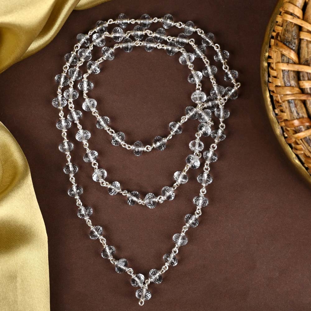 This Sphatik Faceted Elliptical Beads 925 Silver Wire Mala is crafted from high-quality, flawless and natural crystal quartz beads, each shaped into an elliptical form with fine facets that enhance light reflection and energy flow. The beads are individually linked with pure 925 sterling silver wire, giving the mala strength, flexibility, and a refined finish.